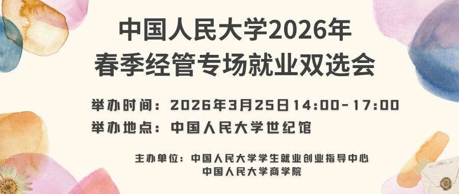 学生邀请函 | 【3月25日14:00】中国人民大学2026年春季经管专场就业双选会 人大就业 · 公众号 · · 2 天前 · |