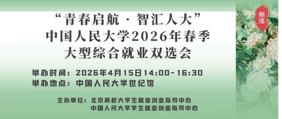 单位邀请函 |【4月15日14:00】“青春启航 · 智汇人大”中国人民大学2026年春季大型综合就... 人大就业 · 公众号 · · 4 小时前 · |