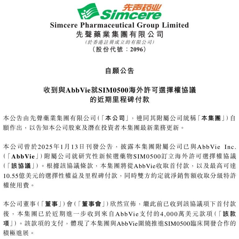 4000万美元!先声药业收到艾伯维三抗TCE里程碑付款 Medaverse · 公众号 · · 2 周前 · |