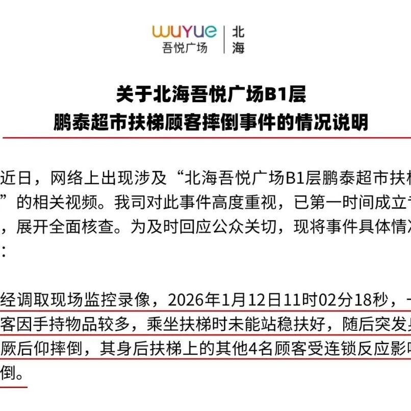 广西一商场通报“老人乘扶梯晕厥致4人相继摔倒”:工作人员全程协助送医,摔倒的顾客仍在医院接受治疗 930老友记 · 公众号 · · 21 小时前 · |