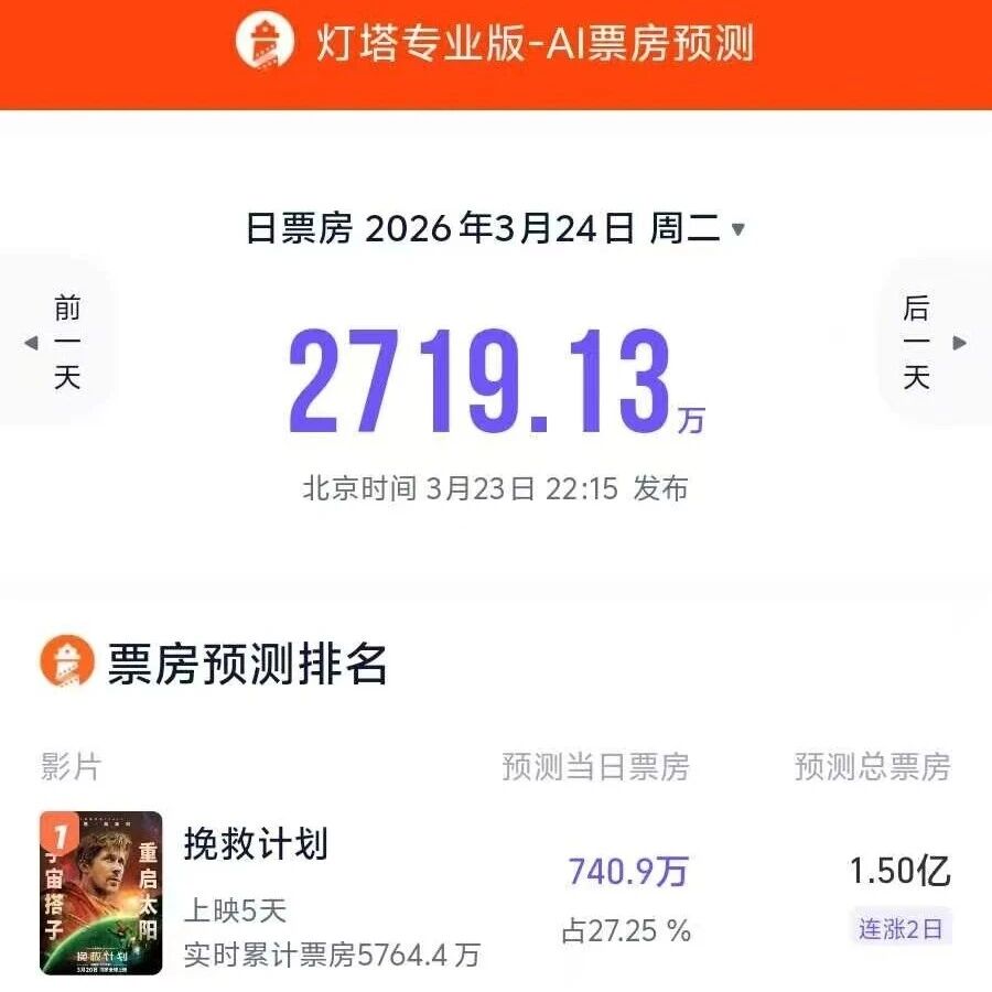 3月24日大盘票房预测2719万,《挽救计划》总票房预测大幅上调至1.5亿 灯塔电影实验室 · 公众号 · · 4 周前 · |