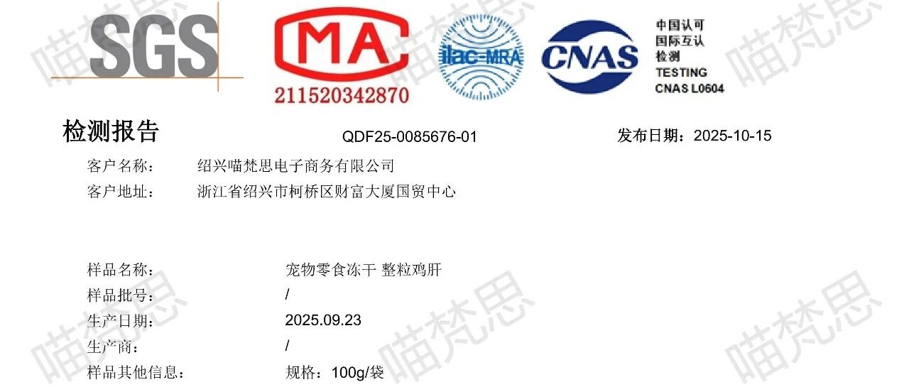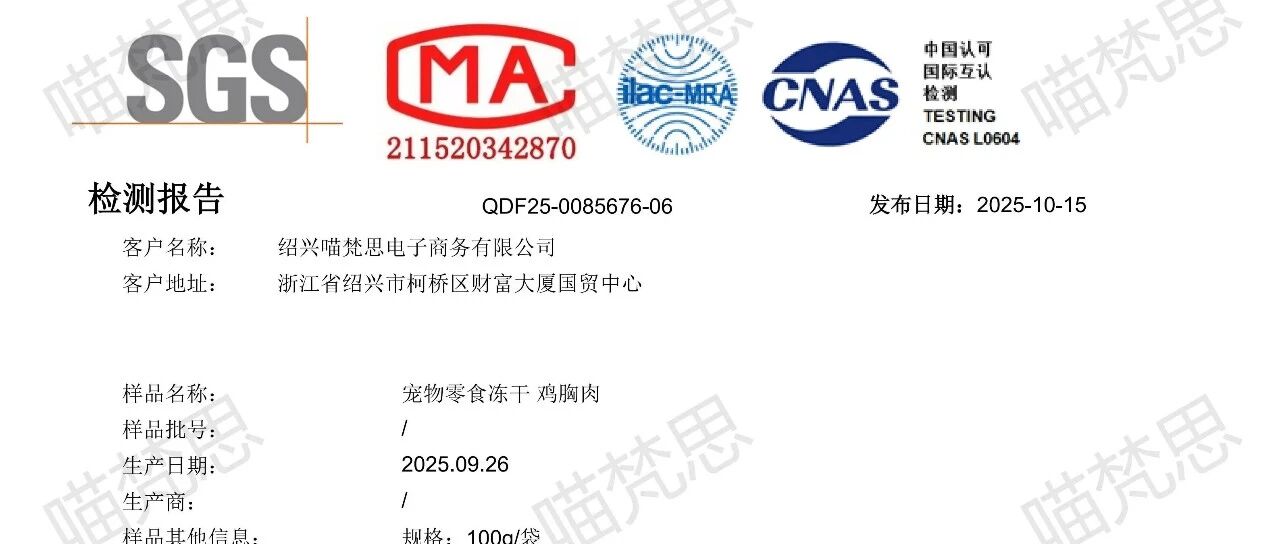 【小灶猫饭鸡鸽】华测检测报告---20251005 喵梵思MeowFans · 公众号 · · 1 周前 · |