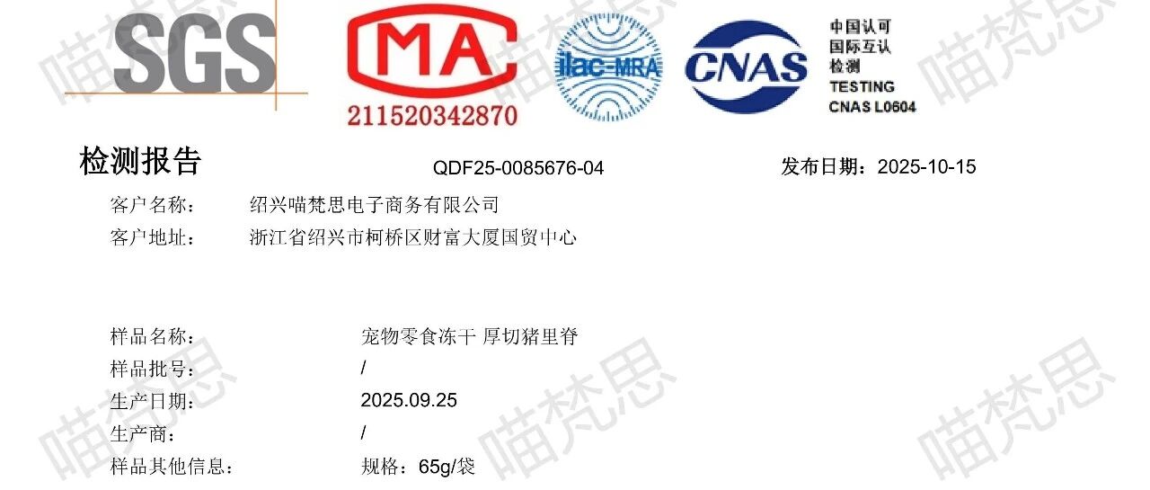 【脆块儿猪肉】华测检测报告---20251009 喵梵思MeowFans · 公众号 · · 1 周前 · |