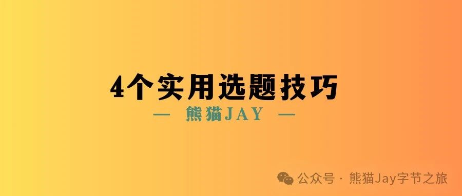 高手都在用的4个选题秘诀!新手一看就懂! 熊猫Jay字节之旅 · 公众号 · · 1 年前 · |