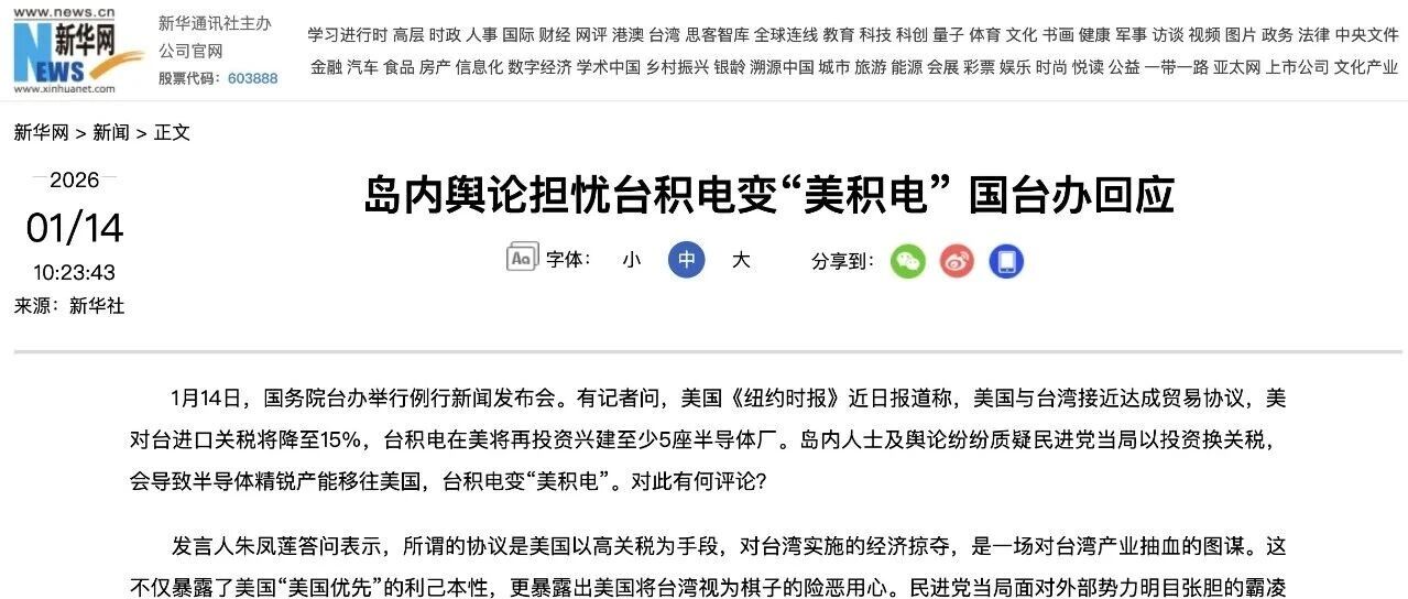 国台办回应:台积电变“美积电” 芯榜 · 公众号 · · 2 天前 · |
