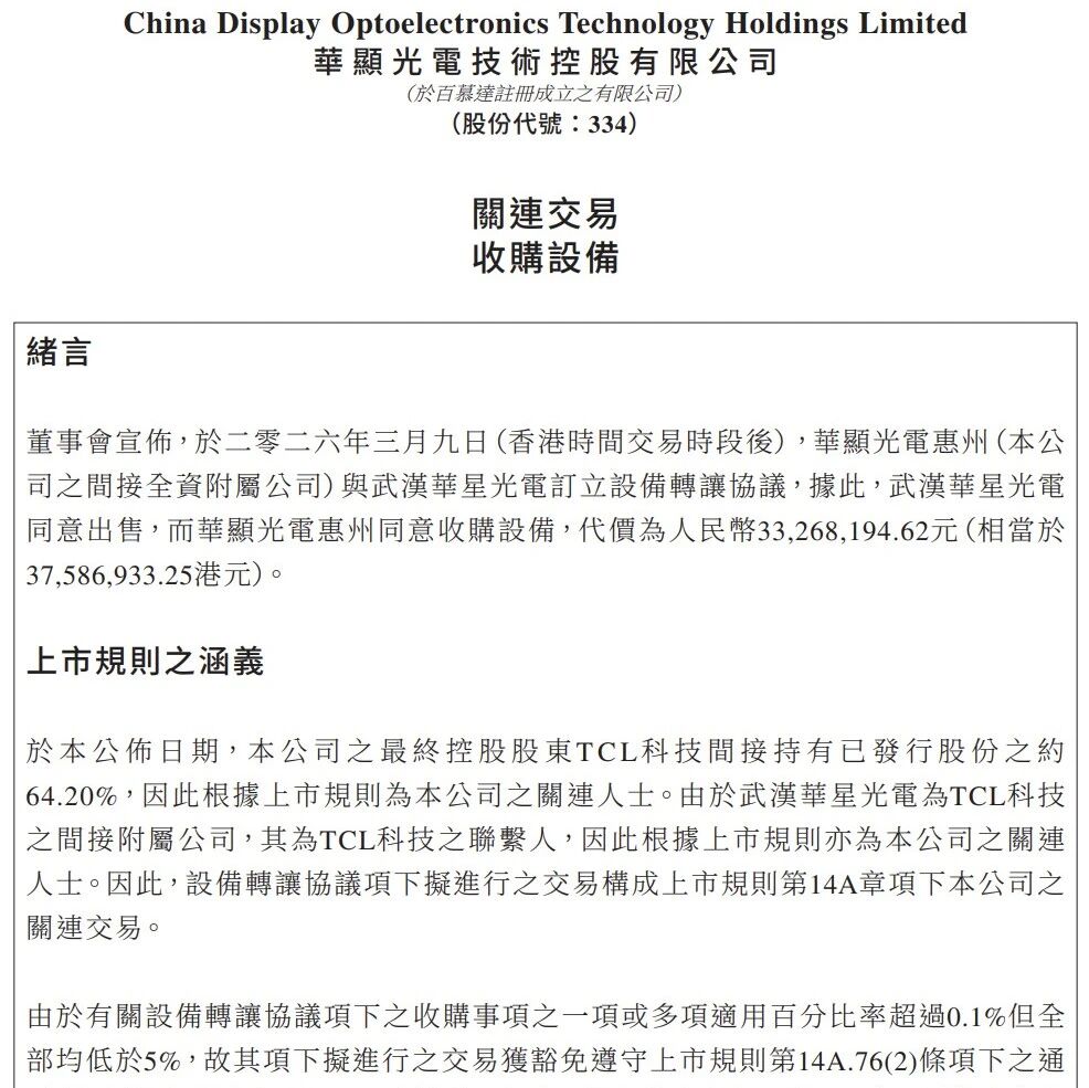 华显光电拟3千万收购关联方武汉华星光电117台LCD生产设备