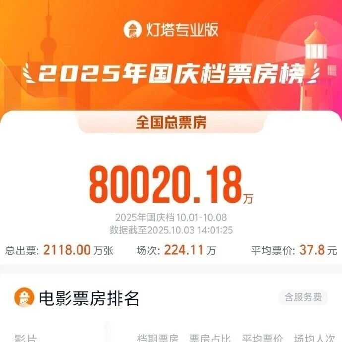 2025国庆档票房破8亿,《志愿军:浴血和平》《731》《刺杀小说家2》暂列前三 海峡都市报 · 公众号 · · 5 天前 · |