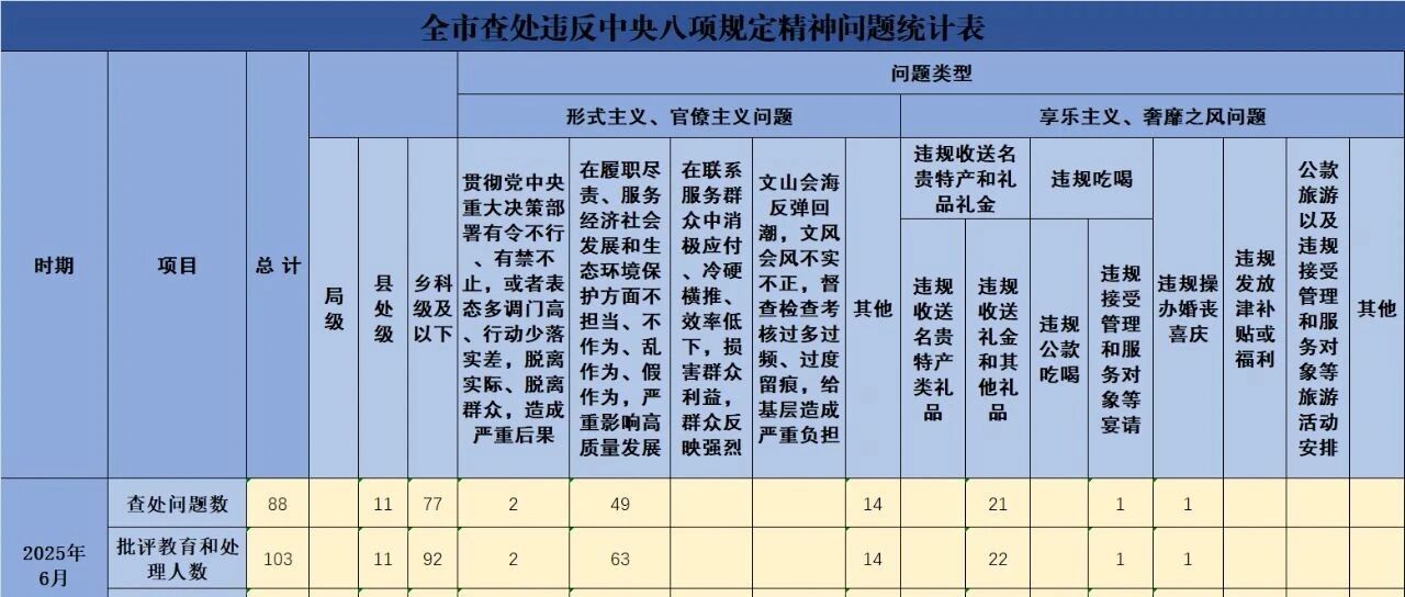 2025年6月全市查处违反中央八项规定精神问题88起