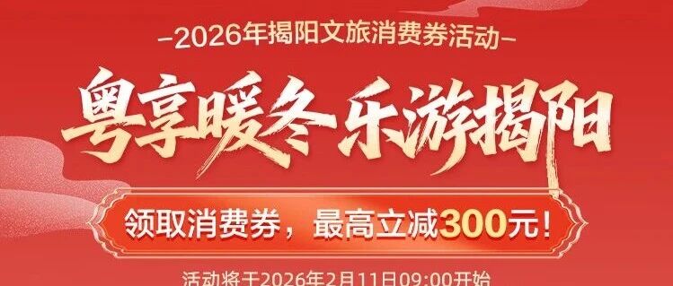 最高立减300元!2026年“粤享暖冬 乐游揭阳”文旅消费券每日9点准时开抢!