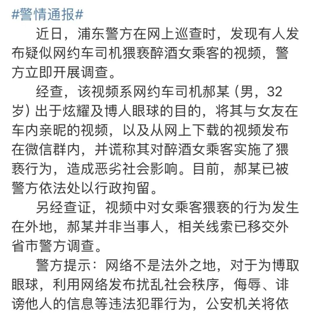 上海警方:网约车司机郝某(32岁),行拘!