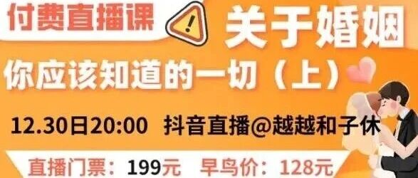 12.30日晚8点《关于婚姻你需要知道的一切》(上)抖音付费直播开课啦!不要错过早鸟价! 李越 · 公众号 · 两性 · 1 月前 · |