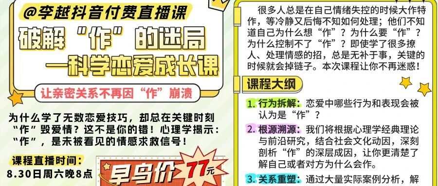 七夕特惠福利别错过!《破解“作”的迷局:科学恋爱成长课》9.30日周六晚八点抖音付费直播开课啦! 李越 · 公众号 · 两性 · 5 月前 · |