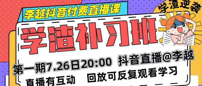 《学渣补习班》7.26日今晚八点抖音付费直播开课啦!开播后恢复原价,早鸟价抓紧gogogo! 李越 · 公众号 · 两性 · 6 月前 · |