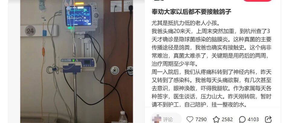 男子疑似接触鸽粪后确诊脑膜炎,“每天头痛欲裂、眼神涣散”,医生:鸽粪含细菌病毒,直接接触或吸入气溶胶...