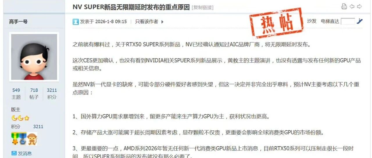 消息称NVIDIA无限期搁置50 SUPER系列显卡 玩机社TechFun · 公众号 · · 6 天前 · |