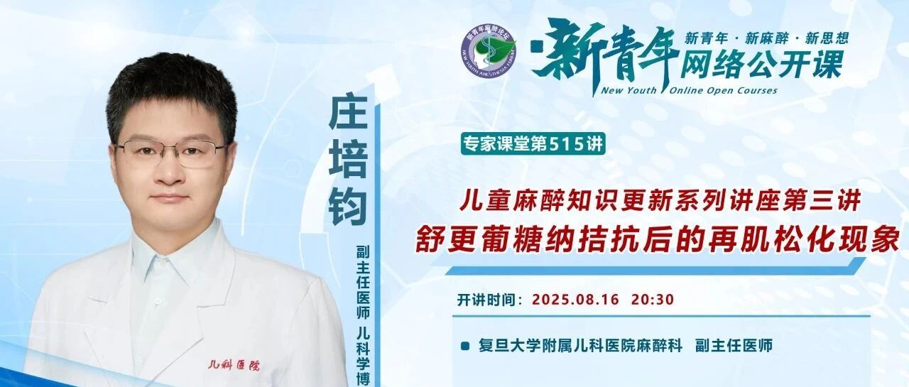 本周公开课 | 第515讲:儿童麻醉知识更新系列讲座第三讲:舒更葡糖钠拮抗后的再肌松化现象(庄培钧 ... 新青年麻醉论坛 · 公众号 · 医学 · 5 月前 · |