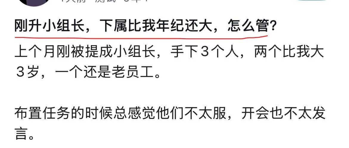 刚升小组长,下属比我年纪还大,怎么管?上个月刚被提成小组长,手下3个人,两个比我大3岁,一个还是老员... 鸭哥聊Java · 公众号 · · 4 天前 · |