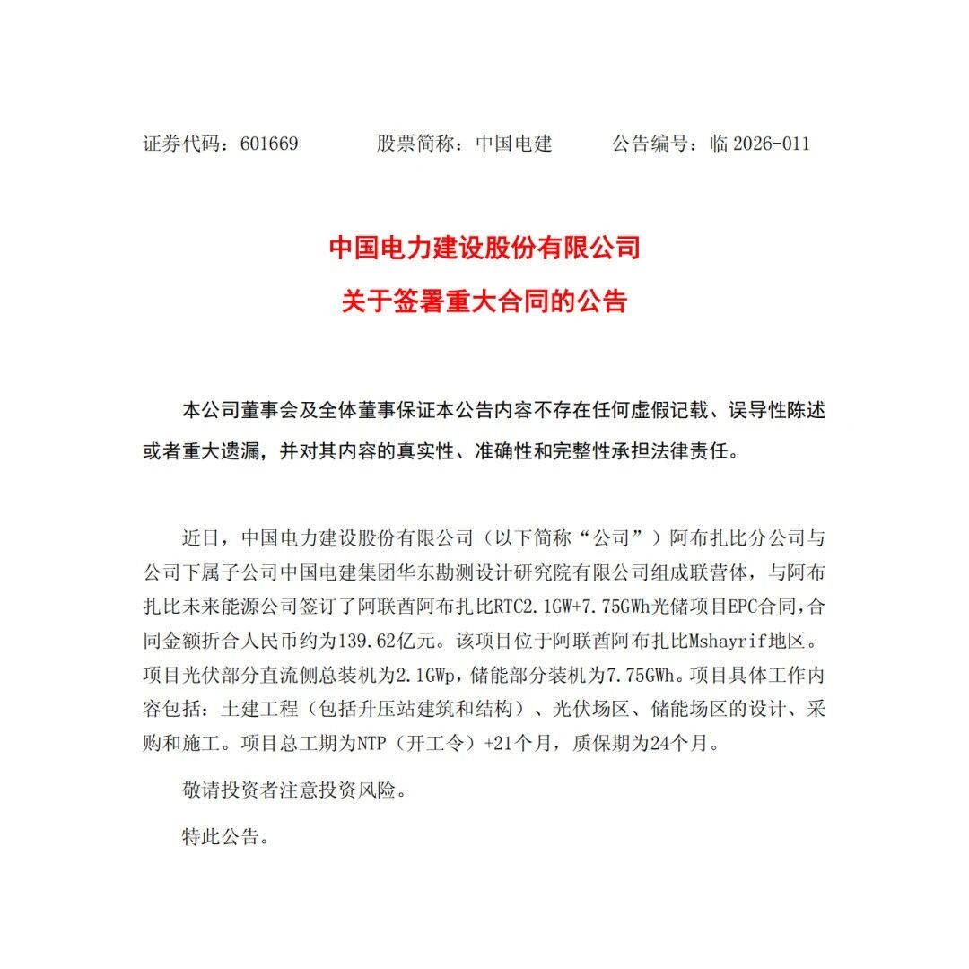 139.6亿,中电建签约阿联酋2.1GW+7.75GWh光储项目 光伏們 · 公众号 · · 4 天前 · |