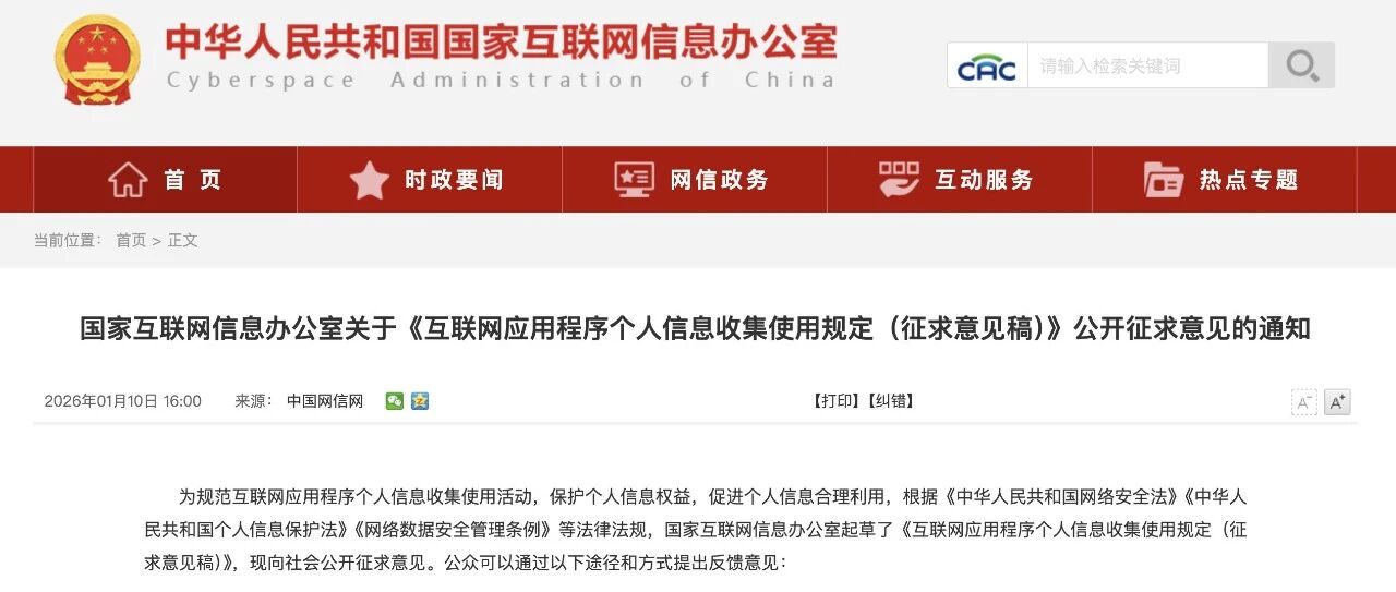 国家互联网信息办公室关于《互联网应用程序个人信息收集使用规定(征求意见稿)》公开征求意见的通知 iPolicyLaw · 公众号 · · 1 周前 · |