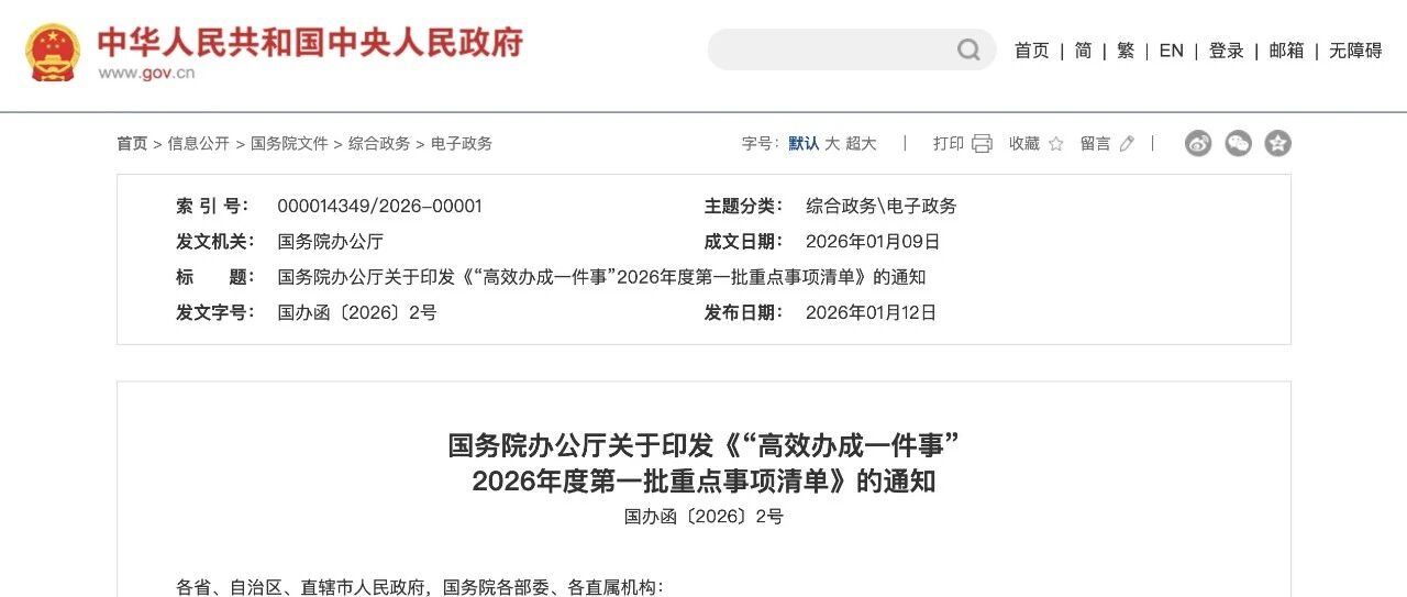 国务院办公厅关于印发《“高效办成一件事”2026年度第一批重点事项清单》的通知 iPolicyLaw · 公众号 · 政策 · 1 周前 · |