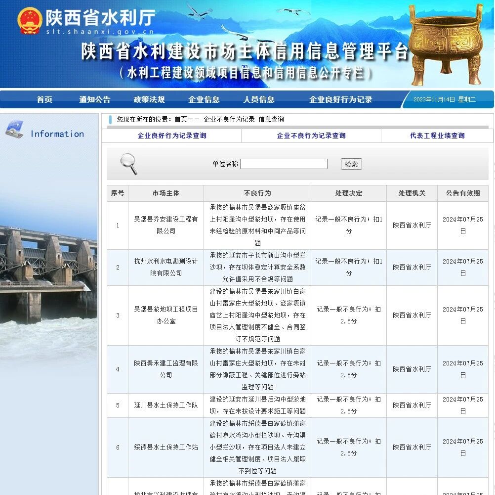 陕西省水利厅通报:杭州水电设计院、榆林市水电设计院等17家单位