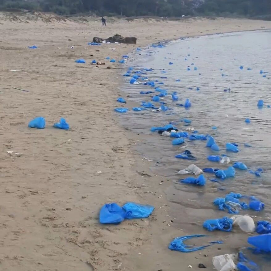 福建平潭海岸遍布大量蓝色一次性鞋套!网友吐槽:晚上“蓝眼泪” ,清晨蓝鞋套