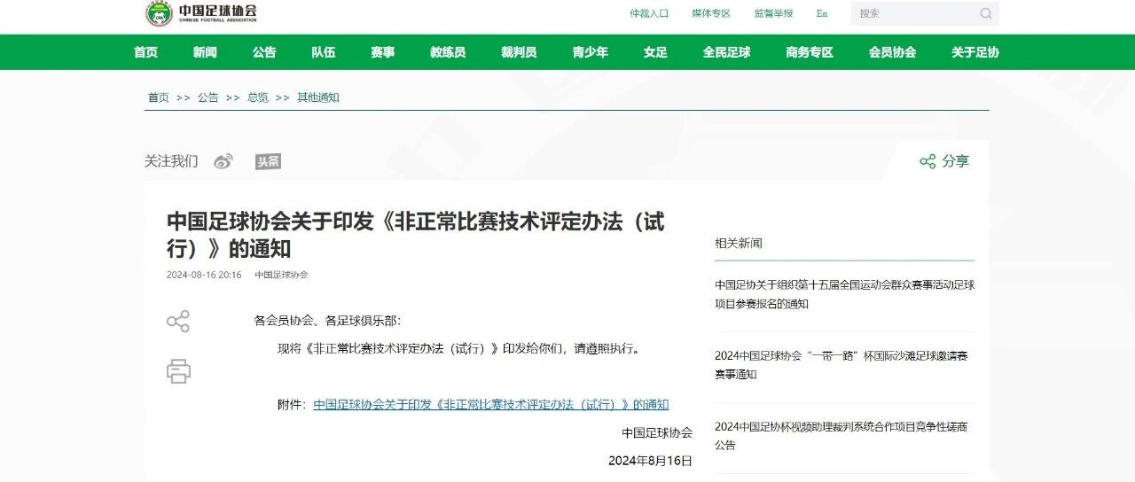 中国足球协会关于印发《非正常比赛技术评定办法(试行)》的通知 体育蓝皮书 · 公众号 · 体育 · 1 年前 · |