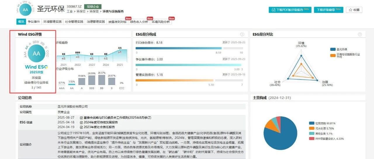 圣元环保ESG获评“AA”级,用行动兑现可持续发展承诺,彰显民营企业担当