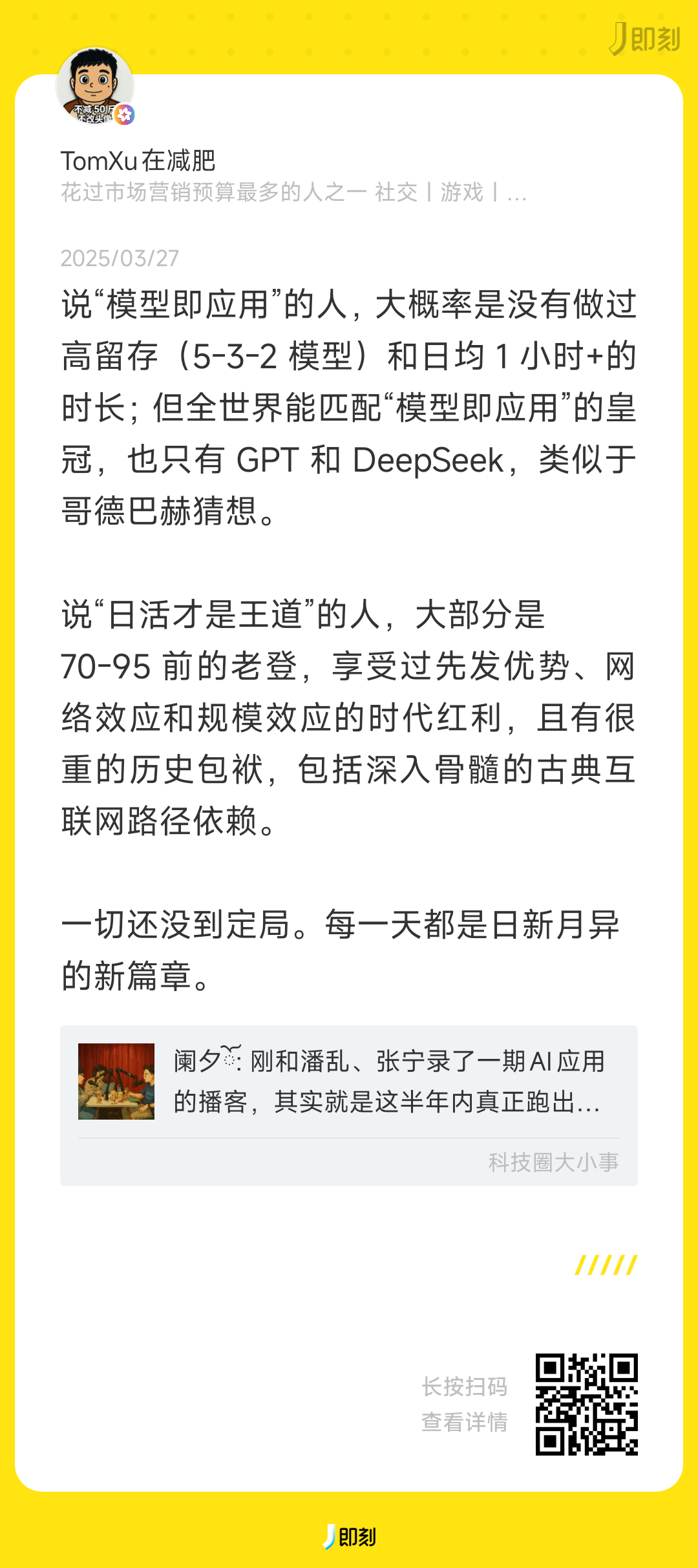 谢谢两位阿里 P10 +老板潜水点赞,我就不点名 cue 出 TomXu · 即刻 · 出海 · 15 小时前 · |